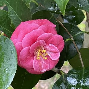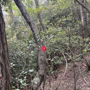 おはようございます😃 小雨のぱらつく、どんよりと曇った朝です。 この冬、初見の藪椿です。 衣浦湾の入江最奥にある、刈谷最古の神社、小垣江神明神社の入り江側の崖にはたくさんの藪椿が生えています。 その中の一本、10mを超す大木が早々と小さな花をたくさん咲かせていました。 まだ、他の木は咲いていません。 藪椿は海岸近くの暖地に育つそうです。 この地はそれに相応しい場所です。🤔 藪椿からはたくさんの園芸種が生まれています。 紅色の一重の花びら、黄色いシベ筒。 小ぶりですが、これぞ椿という美しい花です。😘 椿の原種はヤブツバキとユキツバキだそうです。 日本海側のユキツバキは雄しべが梅の様な梅芯、どちらかというと、サザンカに似ています。🤔 この大木に育つヤブツバキが私は大好きです。 しかし、成長の遅い藪椿、こんな大木はこんな場所でしか見ることはできません。😅