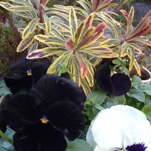 黒いパンジーが気になっていたのですが、HCで見つけました😊 ユーフォルビアゴールデンレインボーと合わせて🖤🤍🌈