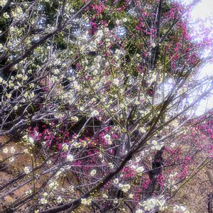 紅梅と白梅 おめでたい構図ですね 💕 稀に 白い花と 赤い花が 1本の木に 咲く時がありますが、これは「源平咲き」と言って 桃や椿、ツツジなどでも見られます。 植物学では 珍しい現象では無く、ちゃんと その仕組みは解明されているようですね。 梅の木の場合、赤い花の木(紅梅)に 白い花が咲くという構図らしいですよ。🥰 決して 誰かが 接ぎ木をしたわけでは無いようです。 写真は 紅梅、白梅と 別々の 木ですよ~~ 🤗 🏷土曜の土手の日