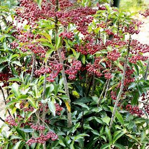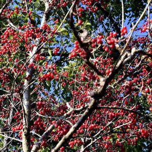 サンシュユ (山茱萸) ( ੭ ˙ᗜ˙ )੭わ~❗ 鈴なり~~🎶🎶🎶 サンシュユの実は、最初 渋みや酸味が強く、生食はできないとされてましたが、時間を於いて完熟すると甘酸っぱくなって生食できるようになるようです。🤤 この実を乾燥させたものは、生薬になります。😀 🏷真っ赤な火曜日 🏷あっ火曜日