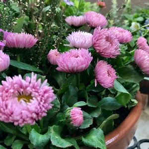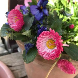 ( ゚▽゚)/コンニチハ 風🍃🌀🍃強いですが 暖かいです🤗 寄せ植えの中のデイジー💖 ピンクが可愛い〜(*´`)