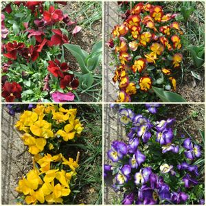パンジー ビオラ 今日はコラボの子たち ①虹色スミレ儚げで素敵 ②黄色いまいち苦手だけど クリーム色は例外 ③シュシュが使用済みティシュ(失礼💦)のよう?クチナシにも見える ④色変するアントワネットと同じ色味のビオレッタ ⑤この子は1人ぼっち💦色味似てるベイビーと📷