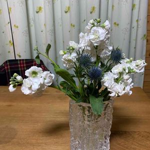 こんばんは♡ 娘がお花を買って来てくれました💐 ユニクロTOKYO銀座店で色々ある中から白いストックに決め、くすんだブルーのエリンジュームを入れて3束¥999+税だったようです。 安っ❣️ ユニクロやるね〜🤗💖💕🎶