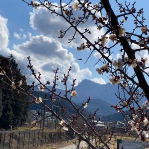 梅の花の向こうに金時山と乙女峠 ここはパークゴルフ場⛳️があり、 今日はたくさんの人たちが楽しんでやっています‼️ 私も先日兄と姉妹で4回やりました❣️