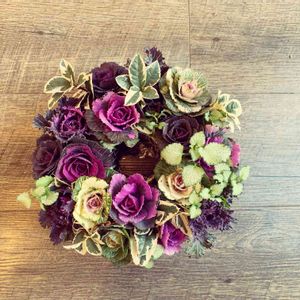 ハボタンの寄せ植えリースです。 ほとんどハボタンのみで作ってみました✨ 我が家のエントランスに置いて、お客様をお出迎え😆