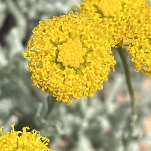 サントリナ・ランブルック シルバー or サントリナ・グレー 別名)コットンラベンダー 和名)ワタスギギク 初めて見るかもしれない 葉を見てラベンダー🪻かな?と思ったけど 丸くて黄色い花がツンツン、それもたくさん出てる 近づくとさわやかな香りがするのでハーブだと確信 いつもの散歩コースをほんのちょっと違って歩くと いつも何かが見つかって楽しい💕💚💕 Wikiより) シルバー色の葉っぱが美しく、花壇やプランターに植えて彩りを楽しむほか、虫除を寄せ付けないコンパニオンプランツとしても活躍してくれます サントリナ属(ワタスギギク属)