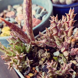 1️⃣この植物が謎です。 いつの間にかザミオクルカスの鉢に生えてきたので、掘り上げて別の鉢に植えました。 ↑が現在の姿です。 (冬、葉が傷んできたので室内に入れました) 過去の写真見てたら、種みたいなのがありました!左下あたりです。 …で、アナタ誰?? お花が咲いたらわかるかな☺️ 2️⃣ブルゲリの隣に謎の種! これはカラスかも。 キレイに隣に置かないでよ… 3️⃣ついでに3年あまり前の投稿から、ディッキアに謎の種! いや、ピーナッツでしょ🤣 みごと真ん中にささってるけど誰が入れたのか謎… 家族ではないし外からは無理、軒下なのでカラスも無理では?