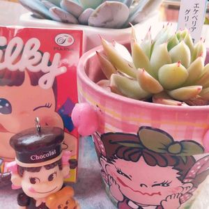こんばんは‼️ 🏷️ペコちゃん祭り お昼過ぎに UPしたけど AIを 突破できなかったので リベンジ します😊 ピンクのリメ缶には アボガドクリーム💕 その後ろの カッコいいのは リップスティック💕 白い鉢は この間 45さんからの 韓国苗です。 名前が わからないの💦 可愛いペコちゃんは はなこちゃんからです🍬 み〰️んな 私のお気に入り💓 リベンジできたかな⁉️