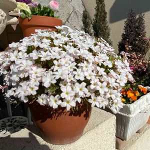 3月3日💕 去年のこぼれ種から花壇にいっぱい芽を出したシレネ、パンジーを植えた鉢の端に小ちゃな苗を移植したらパンジーが見えないくらい鉢を占領💦 可愛いからいいっかぁ〜😊 下は小さな我が家のお雛様、玄関横のニッチにひっそりと🥰