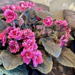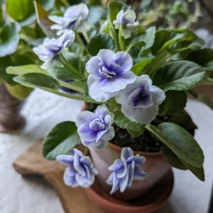 African Violet ‘Dean’s Faded Rose’💓 上から見ると、斑入りの葉っぱの美しさを堪能できるけれど、横から見るとお花がだらんとして見えるかなと思って、シクラメンのように花茎を中央に集めてみた。 このコは動かしやすい茎だけど、ほかのコはもっと瑞々しくて太い花茎だから、ポキっと折れそうでできず。