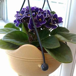 本日のお花がセントポーリアで朝からちょっと元気が出ました 昔の吊り鉢が出てきたので吊してみました 紫の濃い色がかわいらしいです