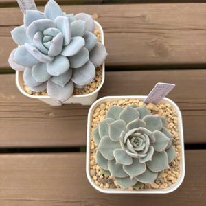 エケベリア雪天使です✨ 1ヶ月くらい前にカット苗でお迎えしました! 2枚目がお迎え時です…あまり変化はありませんね💦 中心がジャムる多肉とお聞きしましたが、うちの子はジャムというほどは赤くなっていません…💦 それでも白い肌がとても可愛いのでOKです✨🤭 元気に育ってほしいです✨🙏😊