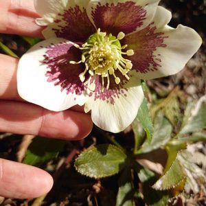 山の庭🏕 今日は風が強くて雪も舞って寒かったです〜❄ クリスマスローズ2つ目咲いてました🌼 赤の…ブロッチかな? この模様好きです💓 他のも無事に咲くといいのですが… 株が大きくなるまでまだ辛抱ですね🌱