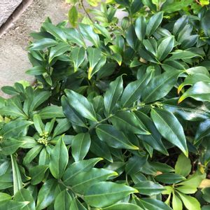 昨日の花です。 ⬆️葉の裏側に白い花がついています。グーグルレンズではサルココッカと出ました。 ➡️根元です。緑色の若い枝がひょろひょろとサツキの枝から顔を出しました ⬅️茶色枝は葉のつきかたが違うので別種かもしれません。全く花は咲いていませんでした。 追記 サツキの陰から生えてきた花なので多分鳥さんが実を落として生まれたサルココッカだと思われます。