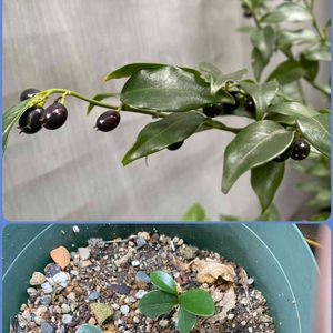 サルココッカ 実が熟しました。 下 去年実から種を取り出し蒔いたのが芽を出しています。