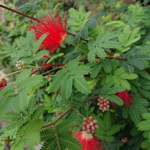 散歩道で出会ったヒネム❤️ 今年も会えて嬉しい💓 可愛い蕾もたくさん ネムノキに似ていますが ネムノキはネムノキ属 ヒネムはベニゴウガン属 なので違います 赤い花に見えるのは雄しべです カリアンドラ ・エリオフィラ 美しい雄しべ 軟毛のある葉の 意味がわかりやすいですね😊 🏷️木曜モフモフに参加します🎵