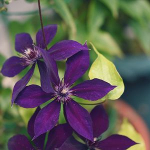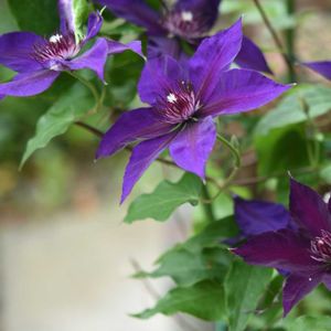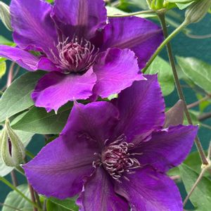 お名前が判明しました、ラヌギノーサ系のクレマチスさのの紫💜更に咲き進んでいます😊💕 去年小さな苗を頂き、一輪咲きました。今年は新芽を沢山付けたので鉢増ししました。 ネットから。 濃い紫。多花性で低い位置からでも節々に花をつける。コンパクトで鉢植え向き。 ■咲き方 新旧両枝咲き ■開花期 5月〜9月 ■草丈 0.7〜1m ■花径 8〜12cm ■花色 紫