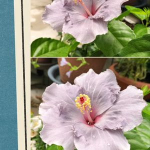 🏷️土曜日は紫の花 ① ハイビスカス ケイト🌺 紫とグレーのようでもあります 昨日 咲きました ② スーパートレニア カタリーナ このあと切り戻しました 好きなお色です👚 ③ 🏷️土曜日はお空の発表会 今朝のお庭 真夏の青い空 月桂樹の向こうに 昨日の 白い三日月🌙が居ます😄 お隣りのサルスベリ💕と空🟦 ユーミンの日 だった 忘れてた私は 応援だけします🙇🏻