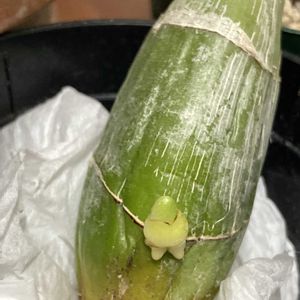 Clowesia (Cl.) Grace Dunn ‘Beaver Valley’クロウェシア グレースダン ビーバーバレー 新芽2本のスペース確保のために、数年古い親バルブを1本ずらし、もう1本を外したけれど、この外した古い親バルブから新芽が出る可能性ってあるのかしら?捨てるしかない?