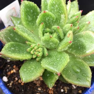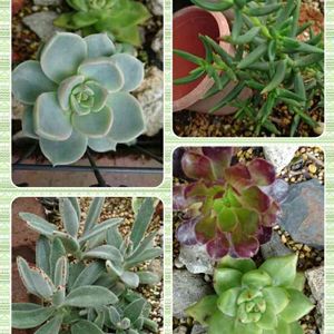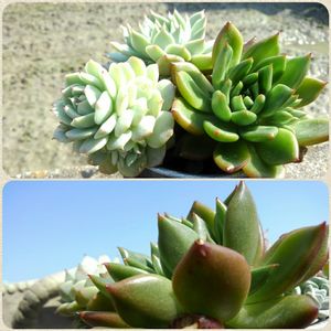 上 夜も外放置 下 夜だけ簡易温室の中 若緑は、ずーと外でいいんだろうか?わさわさ新芽が出てるけど、暴れさせちゃう? 秋に明光園からお迎えして、植えた三株。気づいたらどの子も脇芽を出してくれてる。親株の形崩れるけど嬉しい😄 岡山で秋にお迎えした子。ゆっくりだけど成長してるかなー。