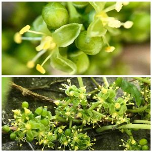 ツタの花 ツタの花の写真を撮りたくて 6月から、ちょくちょくツタの絡まる塀に通い、7月初めにやっと開花🌸 その間、葉をめくったりして様子を見ていたら・・ 近所の人から、なにやら白い目で見られてしまいました。👀 ツタない行動、お許しください😰💦 ブドウ科の花は、皆にていますねー
