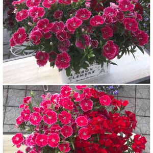 花日和さんのダイアンサス いちごドロップ🍓がわさわさになって来ました✨この見た目がダイアンサスっぽくなくて可愛らしい🍓❤ 鉢増ししなきゃだけど、その前に置き場所作らないと😱