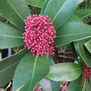 白のスキミヤと並んで植えてありました。開花したらボリュームがあって綺麗でしょうね。