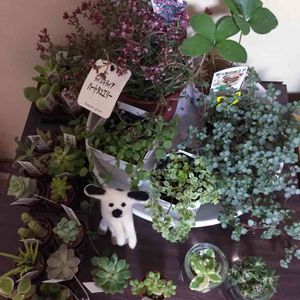 いいなぁ。⤴︎💖 と思うのを 行った先で買ってばかりでまたまた 溜まってしまいました☺︎✨😅 後日、楽しみます😊✨ 集めて置いてみたら 寄せ植えみたいに見える⁉️😅 ワンコも置いてみました😂笑⤴︎