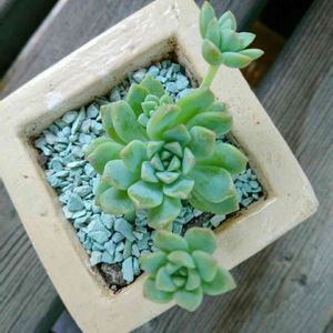 みなさま、こんばんは 花壇の隅っこに10年前に 多肉ちゃん植えて その子はそのまま、大きくならず花壇の隅っこにいます そして、いつも行く近所の冴えない花屋さんにもとうとう多肉ちゃんがやってきました 記念に、お迎えしてみました うふっ、いいかも♡゙ はまったら、大変な事になりそうだけど、お店の多肉ちゃんの入れ替わりがなく代わり映えしないので、見るたびにホッとしたり、残念だったりです 長くなりましたが よろしくお願いします カナさんとこの子と同じですか?