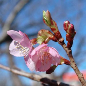 今撮って来ました お隣の庭の河津桜 ポツリポツリと咲き始めました 今年は河津町の河津桜祭りは中止となり とても残念ですが 私はこれから毎日お花見🌸です