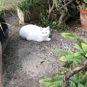お隣の庭のシダの葉の向こうで 休憩中だった猫🐈ちゃん 真っ白で青い目 めっちゃ警戒されてます😸