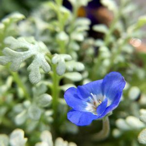 ネモフィラ•*¨*•.¸¸♪ プラチナスカイ✨ あきらめました。。ネモフィラの徒長🤣 日当たり良い場所で肥料はあまり好まない?とか。。そもそも土に入ってるし🥺 去年は切ったりもしてみたけど、もう好きなだけ伸びなはれ。。という訳で 伸びながら咲ききってもらう事に。 懸命に上を向いて咲くんですよね♡ 花スタンドに置けば何とかね(^^;; シルバーリーフもキラキラと綺麗な品種で大好き✨今年は種で何とか繋ぎたい💓