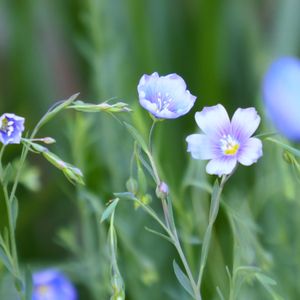 【アマ(亜麻、リナム、フラックス)】 中央アジア原産、アマ科一年草または多年草 長く伸びた細い茎の先端に、小さなブルーの5弁花をつける。 繊細な草姿と可愛らしい色合いの花が風に揺れる姿が美しい。 開花期間中に無数の花が開花するが、ひとつひとつの花は一日花で、朝咲いて夕方には散る。 種子油(亜麻仁油)を薬用、食用などにするほか、茎から採れる繊維はリネン原料になる。 亜麻色とは、亜麻の花の色ではなく、茎の繊維の色で、淡い金褐色のこと。 草丈:30cm-40cm 開花期:4月~7月 花色:青、白 北九州市立白野江植物公園