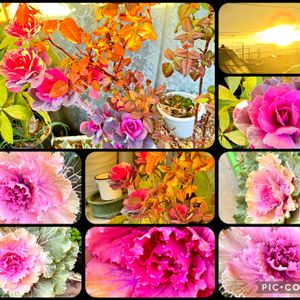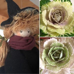 魔女のいたずら⁉️ 上.お正月の生け花の仲間の葉牡丹ちゃん、きっちの窓辺に置いていたら、 下.の中心が緑色なってきたよ。キッチンにいる魔女さんのいたずらかしら⁉️