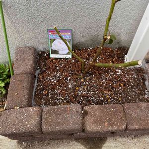 ミニレンガを積んで 小さな花壇を作りました(^^) レンガは積んだだけ💧 土が流れ出ないよう、内側に不織布を使っています 今年お迎えしたオールドローズの白バラ ブールドネージュ 育ってくれるといいなぁ