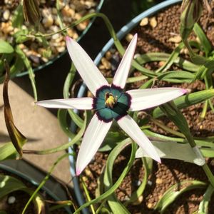 宇宙の星のような深海のマリンスノーのような中心の青いブロッチと黄色い花粉がとっても綺麗なスピロキシネ・カペンシス・ホワイト! 1番好きな花が咲きました🌼 中心部が青いタイプは何年も探していて、やっと今年咲いた球根が青いタイプで本当に嬉しいです😍