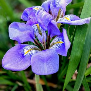 寒い冬に咲くアヤメ 花は径8cmほどの紫色 基部に白色地に黄色と 紫色の模様が入ります🎶 💜💛🤍💚 花は葉より低い位置で咲く 寒咲菖蒲(かんざきあやめ) アヤメ科