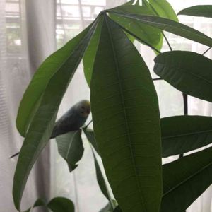 パキラが、大きくなりました❣️ウィルちゃんには無害なのですが、細い枝にとまられたパキラは迷惑そう😅 かじらないように気を付けてますが、葉っぱに傷が増えてきました💦🌿🐦♪