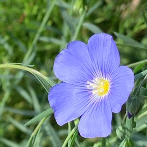 亜麻 アマ 💜 種まきっ子咲きました( *´꒳`*) 1日花で夕方うちに帰ると しぼんでいるけど次のツボミが また開く❁⃘*.゚❁⃘*.゚❁⃘*.゚ ブルーのシノグロッサムと隣どおし 植えてみました💜💙 爽やかよ🎐 𓈒𓏸