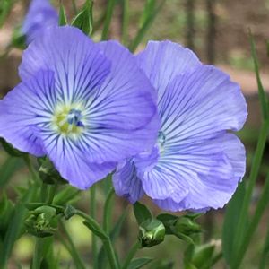 早くも《亜麻》が咲き始めていました💙フラックスとも この花の青い葯が好き♬☺️ 茎から採った繊維は亜麻糸(リネンの原料)で淡い茶色 これが「亜麻色の髪」の色👩🏻🦰 種からは亜麻仁油が作られます♬ 1メートルくらいの背の高い花🦒🌿