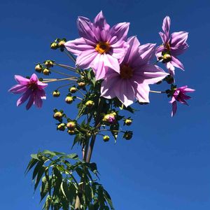 連投します。 皇帝ダリアが咲き始めていました。 比較的下の方に咲いていたからよかったです。 大好きな青空とのコラボも撮れました。 蕾がいっぱいでこれからますます楽しみです♪