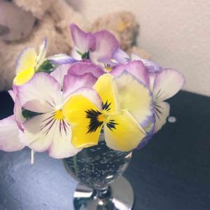 パンジー・フリズルシズル♥ こんなに可愛く咲いてる子も切り戻し✂︎しました💡 またモリモリに咲いてくれることを願って(>人<;) わが家には洒落た花器がないので、お猪口に(^O^;)