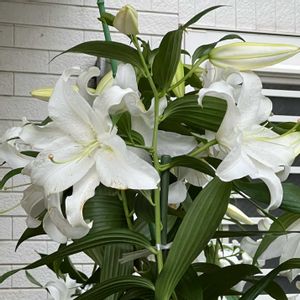おはようございます💠💠 ⛅️晴れ間が見えたかと思うと 降ったり止んだり☂️ お天気不安定です 屋外に出る際は くれぐれも 気をつけましょー♡♡ 🌿白百合🤍カサブランカ (Casa Blanca 🇳🇱) 🌳南側の陽当たり良しの あちこちに 香り高き大輪の カサブランカが開花しました🧡 でも 🍃🌪強風雨で 大揺れ💦 花茎を支柱で支えてみたから 大丈夫かな😅