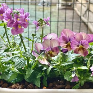ネメシアさんと ビオラ ももか しんしんさん♡ 似た感じの色合いの二つを寄せました♪ 今頃買うしんしんさんは根がビニールポットパンパン。ほぐしてから植えました😊 小ぶりの鉢に植えたからちょっと窮屈になりそう💦