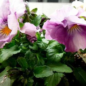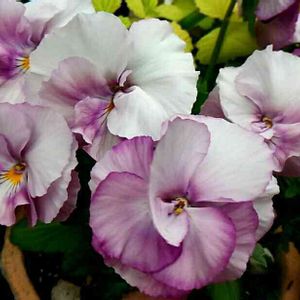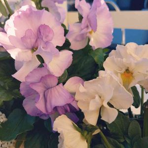 買い物で立ち寄ったホームセンターで苗売り場をのぞいて、ふと目にとまった白いパンジー 黄色のポッチとうっすらラベンダーがのって可愛いです💕 ハルディンさんのフェアリーワルツだそう 左はおちあいけいこさんの優しいビオラ💗