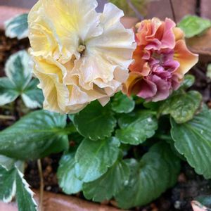 ビオラ 右上・フェアリーワルツ 八重咲きパンジーらしいです。 右下・クランベリー この子達も寒さに縮こまってます🥶 でも、鉢植えしてから増える事もないですが、ずっと咲いてます。