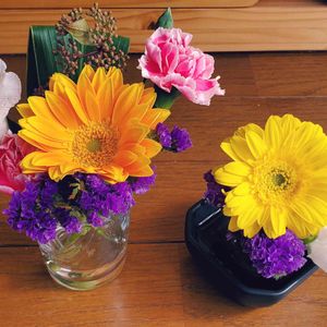 お花の飾り方が難しいです。 茎を短くして飾る方法もあると知り、即やってみました! でもガーベラはお花の部分が重いため、とても飾りにくいです。 いろいろと試してみようと思います。