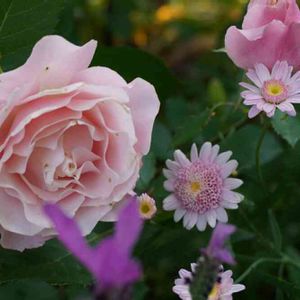 連投失礼します😊 コーネリアさんへの小路のダフネ🌹💓 低い所でマーガレットやフレンチラベンダーと 戯れて咲いています🌸🌿 明日からは又雨が続くようです バラたちもそろそろ終盤かな…(._.)