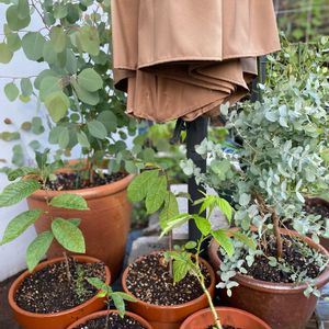 地味なpicでしょー。 でもね、私にとってルンルンする物ばかりなの💓🎶 ユーカリのポポラス、グーニー、アカシア、実生ポポー3鉢、品種不明ラズベリーです。 今年、誕生日プレゼントにガーデンパラソルを買ってもらい、設置しましたが。。 パラソルを開くと重りを置いても、ブロック置いても飛んでいきそうなので、鉢を重りのうえに集合させました😆💦 ポポーとラズベリー以外は寒くなる前に室内移動します。 かなり重い😅💦💦 ポポーは地植えに一株、室内に2鉢あります。まだ一度もなってません😬❣️