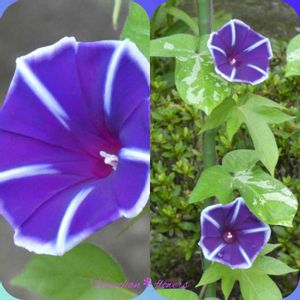 「今朝の朝顔」 早起きして、撮って来ました。🤗 左下は、同じ朝顔の列に ダイソーで買った朝顔のタネを蒔いた所、数日で発芽🌱。 こちらも楽しみ💠
